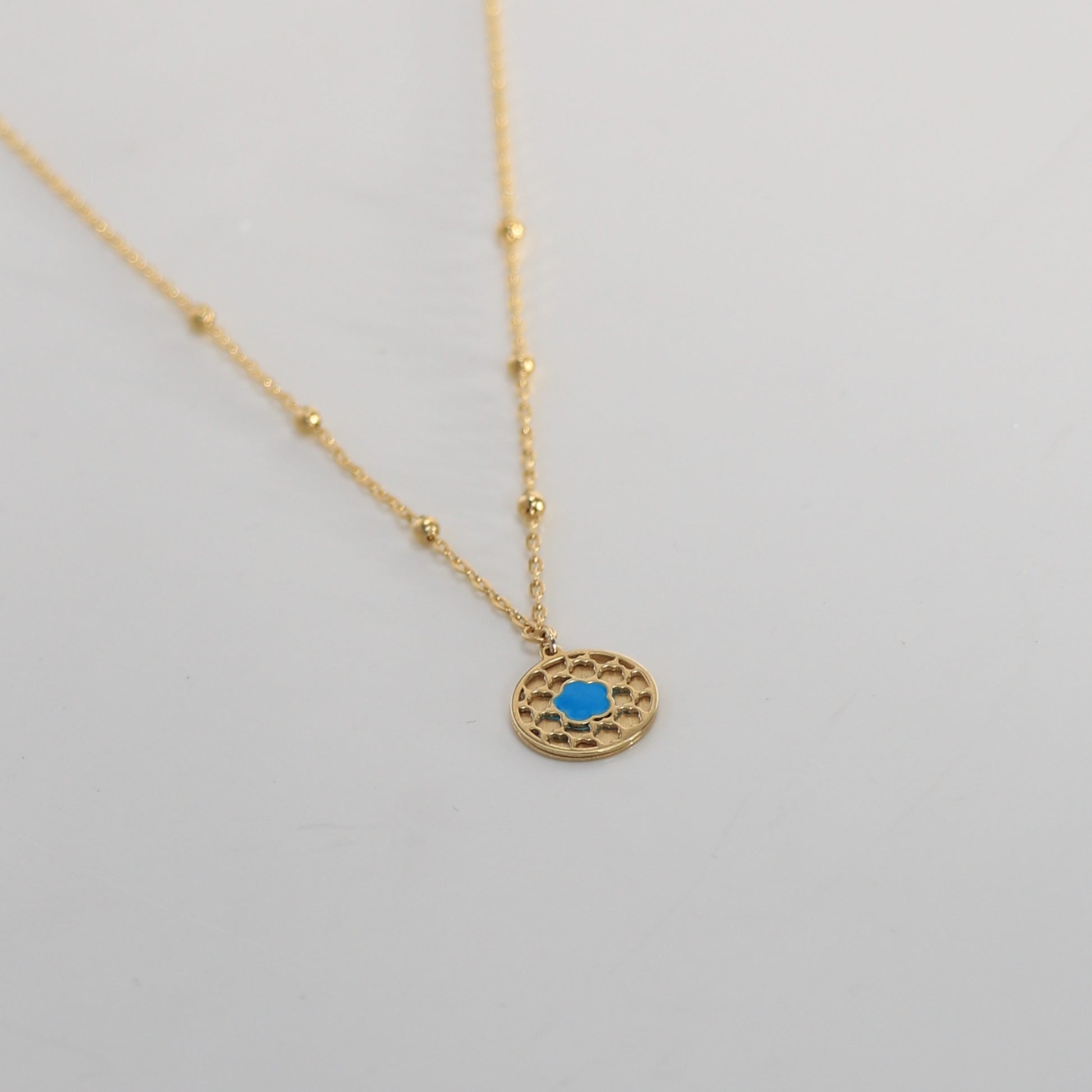 | Design Style | Elegant Gold Pendant Accented with Blue Stones |